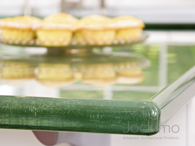 Jockimo’s glass countertops can be finished with numerous edge treatments: